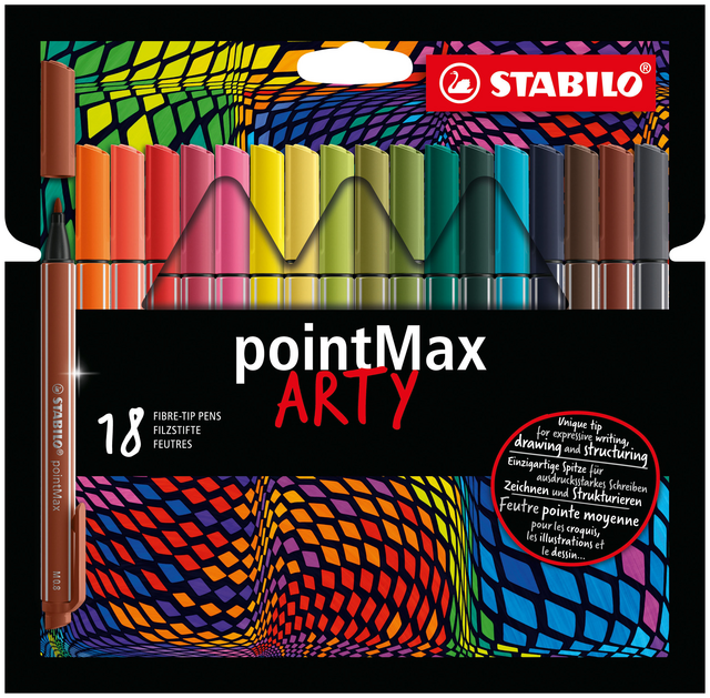 Le Stylo-feutre pointMax ARTY de Stabilo, présenté dans un étui carton de 18, est un outil indispensable pour les professionnels à la recherche de qualité et de performance. Ce stylo-feutre se distingue par sa pointe nylon ultra robuste, offrant une largeur de tracé de 0,8 mm, idéale pour les travaux de précision et les illustrations détaillées.