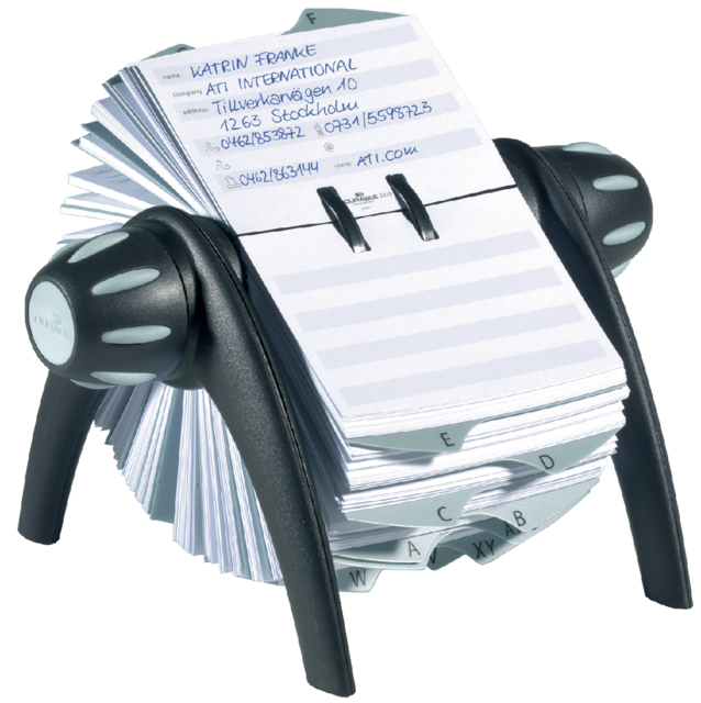 * Système rotatif pour coordonnées de téléphone et adresses. * Avec 500 fiches pré-imprimées (104x72mm). * Les fiches sont interchangeables. * Avec registre alphabétique de 25 éléments. * Dimensions 215x120x185mm