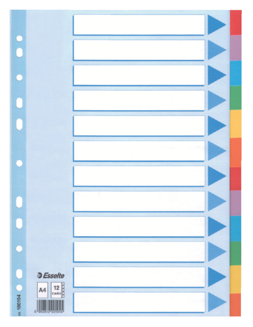 Ces 12 intercalaires colorés apportent de la couleur à votre classement et permettent un tri facile. * Ces intercalaires sont fabriqués à partir de carton recyclé Le recto offre un large espace pour la description du contenu et comporte une bande de perforation renforcée Perforation universelle : 11 trous, convient à divers mécanismes de reliure. * Format A4 Carton résistant de 160 g/m² Fabriqué en carton recyclé de haute qualité, certificat Ange Bleu.
