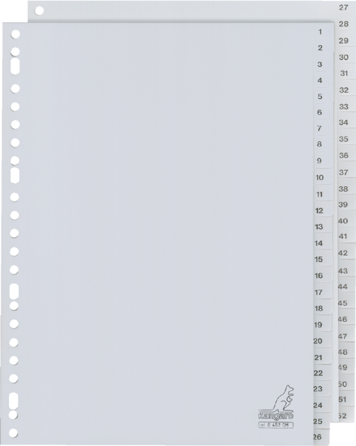 Description détaillée* Intercalaires en PP gris 120mµ. * Les onglets sont imprimés d’une face avec des numéros en noir. * Emballé par set sous cellophane.