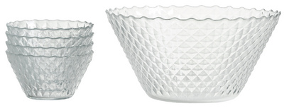 Description détailléeEn verre transparent, surface extérieure à facettes, bord cannelé, forme conique et grande profondeur, contenu: 1 saladier 250 mm, 4 bols 125 mm