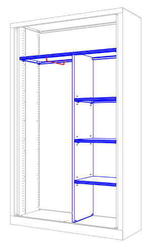 Le Kit comprend : 1 tablette penderie, 1 support cintre, 1 séparation verticale et 3 tablettes réglables en hauteur.