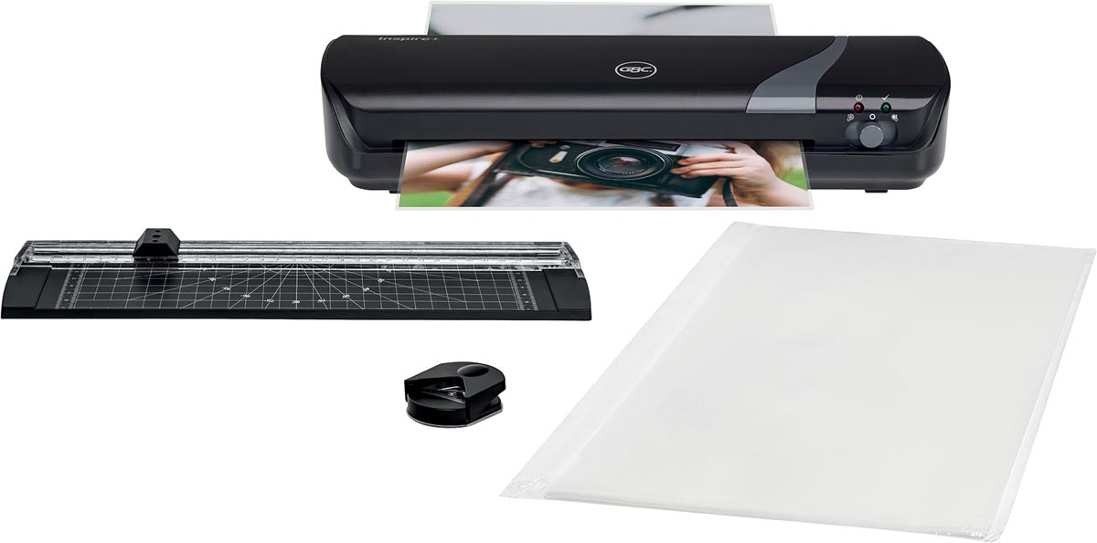 Ce kit de plastification A4 4 en 1 réunit les outils parfaits pour la plastification et les loisirs au quotidien. Idéal pour la maison ou l'enseignement. * Caractéristiques du produit : * L'ensemble comprend 1x Plastifieuse A4 GBC Inspire+ (noir), 1x Arrondisseur d’angles pour couper les bords et les coins, 1x Coupeuse pour couper facilement et en toute sécurité les documents à la taille souhaitée, 5x Pack de démarrage de pochettes de plastification (2x75 microns). * Plastifie tout format de document, de la carte d'identité au format A4. * La plastifieuse est prête à l'emploi en 4 minutes seulement. * Utilise des pochettes de plastification de 2x75 à 2x125 microns. * Réglage à froid pour utilisation avec les pochettes de plastification auto-adhésives à froid, pour protéger les matériaux sensibles à la chaleur. * Plastifie jusqu'à 8 pochettes en 10 minutes. * Levier de déblocage qui vous permet de retirer manuellement les pochettes mal insérées ou bloquées. * Indicateur LED indiquant que l'appareil est sous tension (rouge) et qu'il est prêt à l’emploi (vert). * Pour de meilleurs résultats, utilisez les pochettes de plastification GBC. * Dimensions de la plastifieuse (lxHxP) : 350x130x60mm. * Dimensions de la coupeuse (lxHxP) : 352x95x24mm. * Coupe jusqu'à 5 feuilles à la fois. * Garantie 1 an.