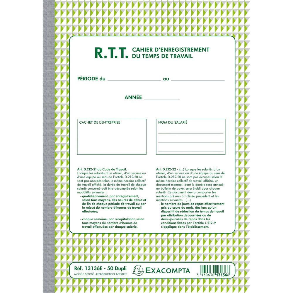 Chaque page du carnet est conçue comme un relevé individuel d'heures travaillées, détaillant les horaires de référence, les différents types d'absences (jours fériés, RTT, congés payés, maladie ou congé sans solde) et le compteur de RTT. Le carnet comporte 50 feuillets numérotés et autocopiants, avec un original et une copie pour chaque feuillet.