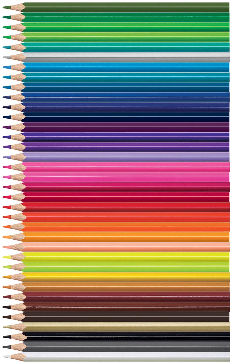 Les couleurs assorties contenues dans cet étui carton de 36 crayons comprennent : noir, gris, chocolat, marron, gaia dune, jaune soleil, jaune citron, orange, ton chair, rouge, rouge fraise, rouge clair, rouge grenadine, fuchsia, violet, aubergine, rose, bleu foncé, bleu acier, bleu, marshmallow, bleu nuit, bleu marine, vert d'eau, jade, vert kiwi, vert jungle, vert, vert pomme, blanc, or, argent, rose fluo, jaune fluo et orange fluo.
