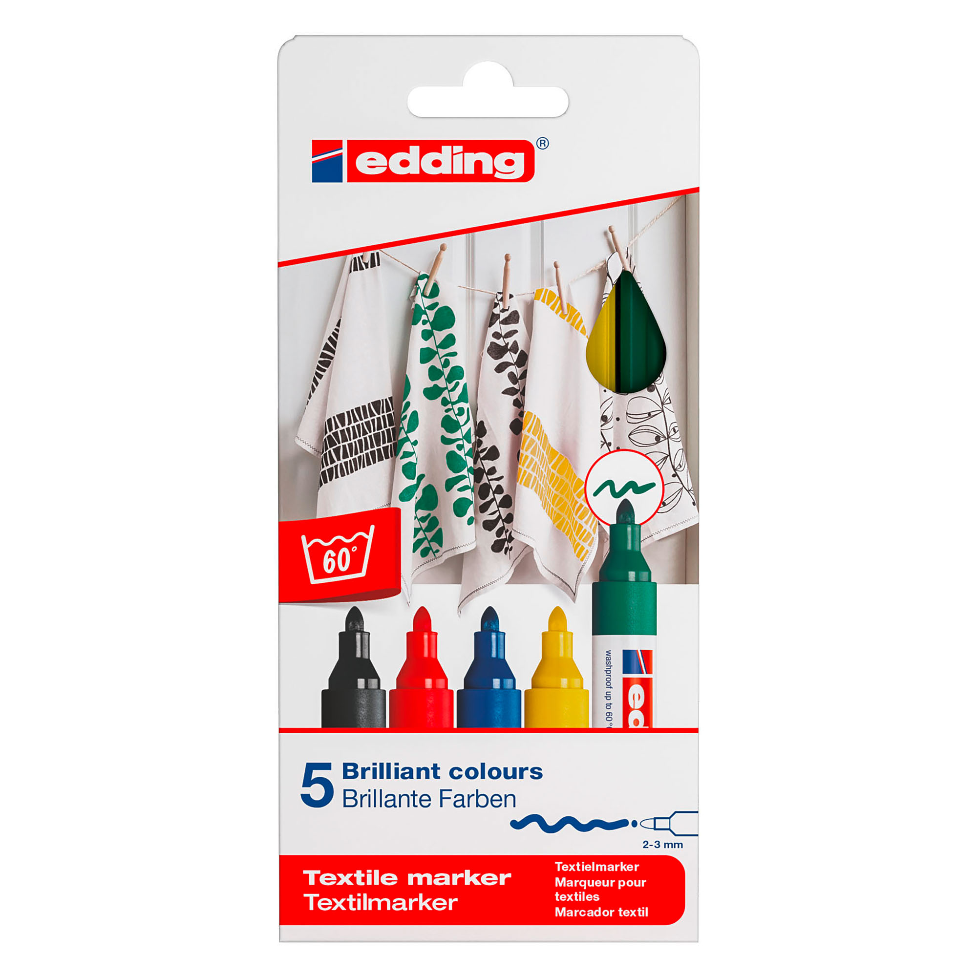 Le marqueur permanent pour textile Edding 4600 sera votre compagnon pour des décorations et des dessins résistants au lavage sur la plupart des textiles clairs comme le coton, la soie et le lin. Sa pointe ogive a une largeur de 1 mm. Son encre pigmentée a une odeur neutre et présente une extrême résistance à la lumière. La couleur est indélébile jusqu'à 60 °C après la fixation au fer à repasser (sans vapeur).