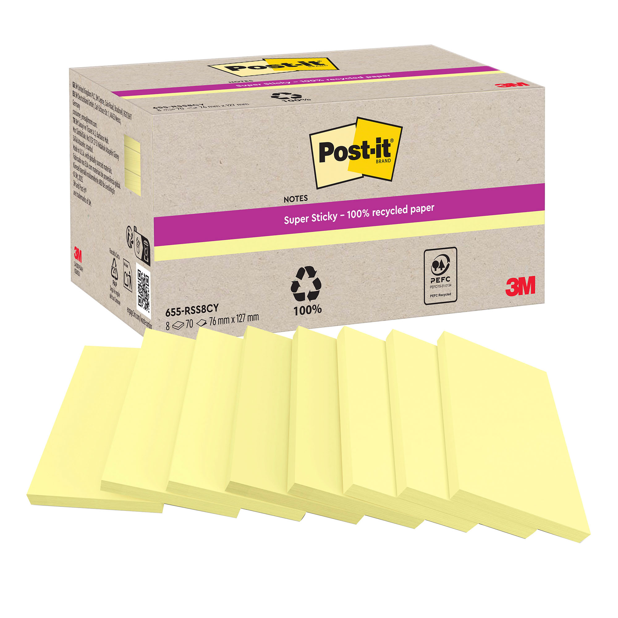 Blocs de Notes Post-it® Super Sticky 100% recyclées. Sans emballage individuel, en boîte distributrice 100% en carton recyclé mono-couleur pour limiter l'usage d'encre. La tour est composée de 12 blocs jaune pastel de 70 feuilles. Le papier est certifié 100% PEFC. L'adhésif des notes est fabriqué avec 60% de ressources renouvelables.