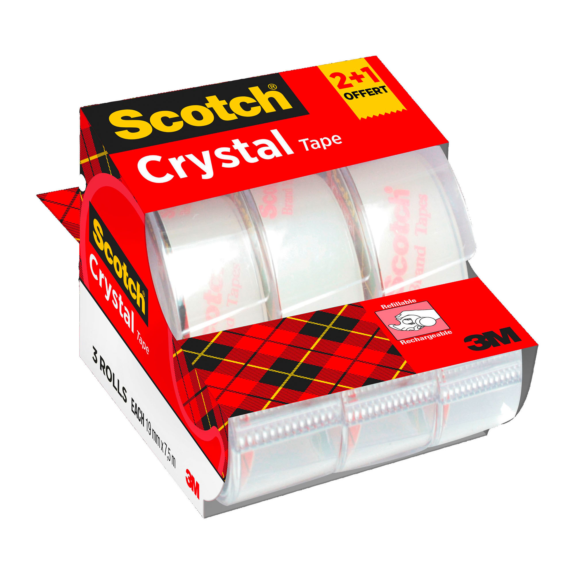 Description détailléeDévidoirs à usage unique. Livrés avec un ruban adhésif Scotch Crystal largeur 19 mm, longueur 7,5 m dans chaque dévidoir.Adhésif brillant, haute transparence. Ne jaunit pas. Découpe à la main. Déroulement silencieux.Lot de 2 dévidoirs + 1 offert.