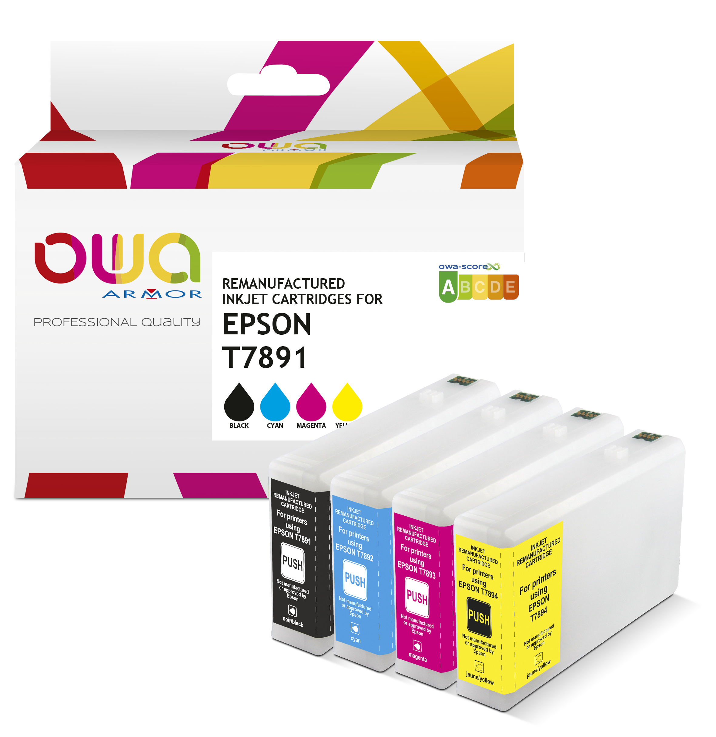 Autres cartouches avec les mêmes compatibilitésCartouche d'encre remanufacturée OWA - haute capacité - Jaune - pour EPSON T7894à partir de25,50 € htPack de 4 cartouches d'encre remanufacturées OWA - haute capacité - Noir Cyan Magenta Jaune - pour EPSON T7891, T7892, T7893, T78942 avis98,84 € htCartouche d'encre remanufacturée OWA - haute capacité - Cyan - pour EPSON T7892à partir de25,50 € htCartouche d'encre remanufacturée OWA - haute capacité - Magenta - pour EPSON T7893à partir de25,50 € htCartouche d'encre remanufacturée OWA - haute capacité - Noir - pour EPSON T7901à partir de22,50 € htCartouche d'encre remanufacturée OWA - haute capacité - Cyan - pour EPSON T7902à partir de20,95 € ht