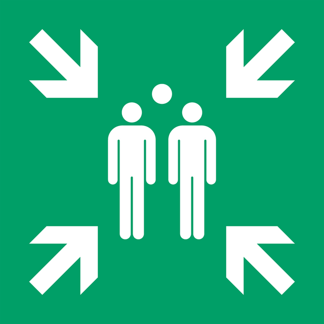 aque en plastique facile à monter pour indiquer un point de rassemblement. Conforme à la norme générale ISO 7010, reconnue en Europe. Ce symbole indique de manière simple où se rassembler en cas d'urgence.