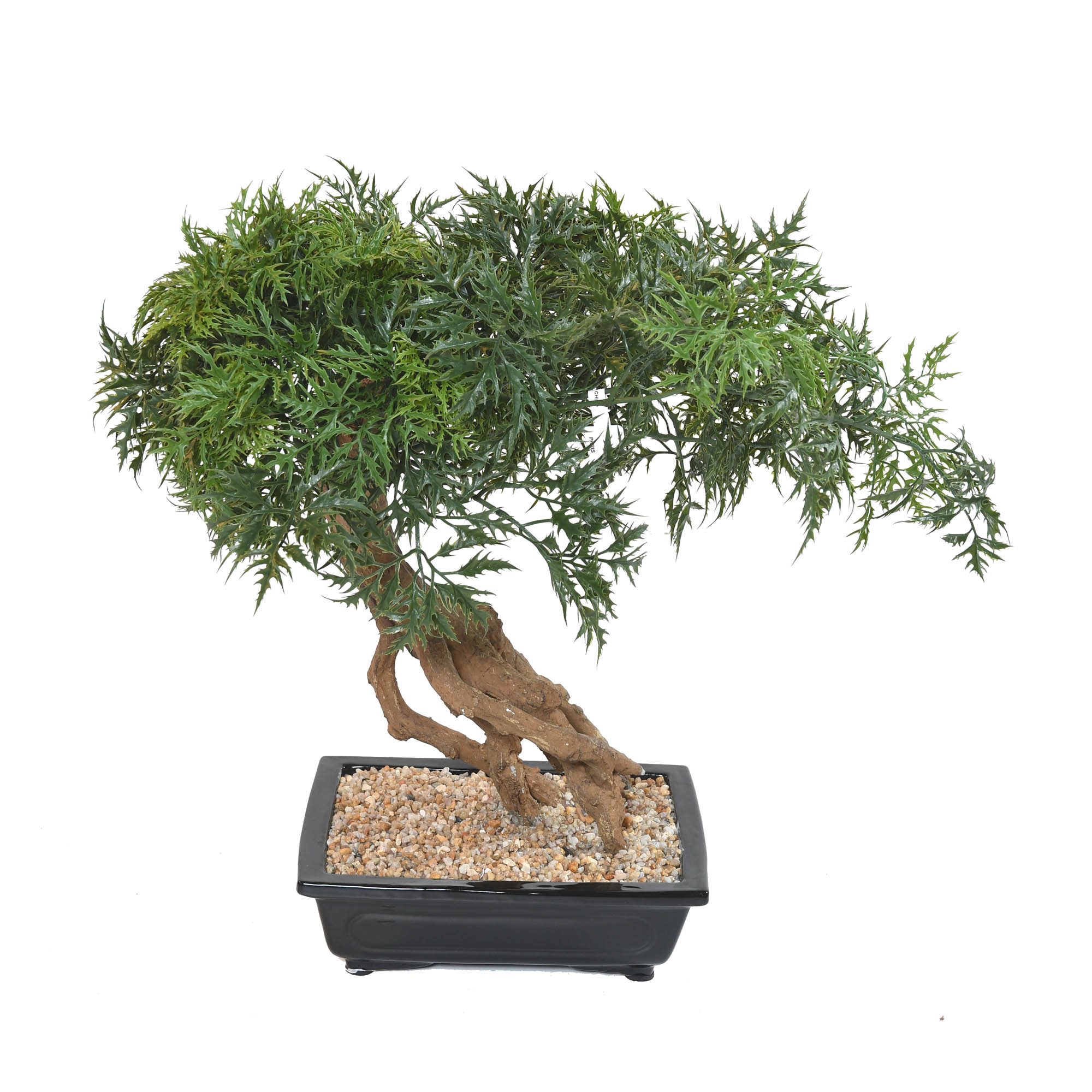 Bonsaï Aralia 60 cm artificiel, Tronc en résine et bois de diamètre de 7cm, Feuillage en polyéthylène dans une coupe céramique noire 30x22x9 cm, surfaçage en graviers.