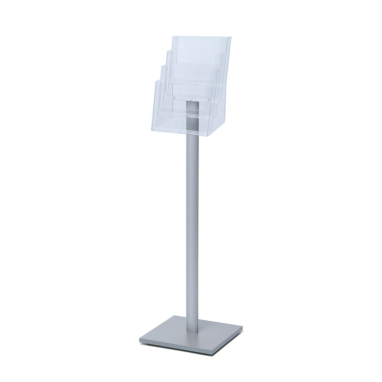 Un porte-brochures élégant avec un mât en aluminium argenté anodisé. Exposez vos brochures, dépliants ou émissions sur le présentoir en plastique. Ce présentoir indépendant est parfait pour les formats A5, A4 et DL. Optez pour des présentoirs à un, trois ou quatre compartiments au niveau supérieur.