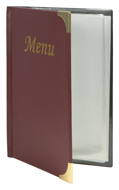 Description détaillée* Divers protège-menus à utiliser dans la restauration. * Protège-menus de style classique avec inscriptions en lettres dorées. * Finition avec coins renforcés. * Disponible en différents formats.