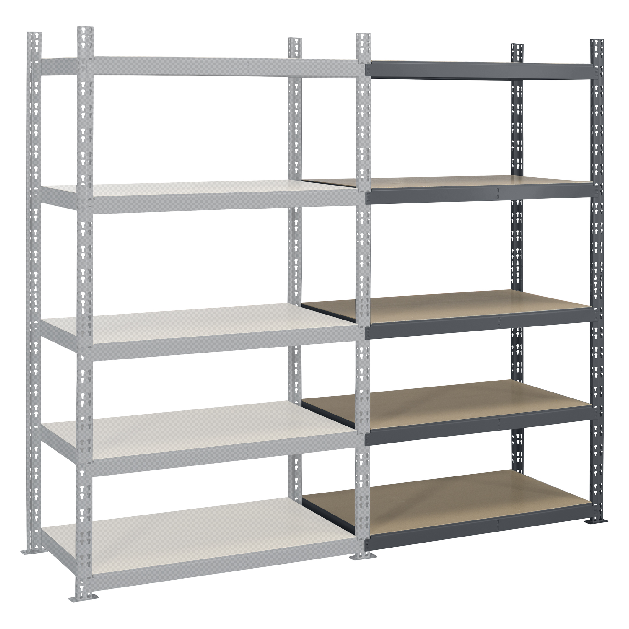 Pour un rangement optimal, ces rayonnages s’équipent de tablettes réglables en hauteur tous les 2,5 cm équipées de plateaux en agglomérés, épaisseur 8 mm.