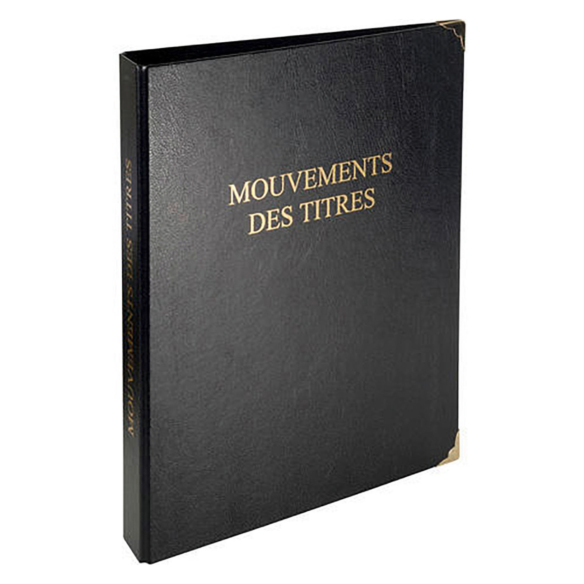 La reliure Exacompta est composée d'un classeur rembordé plastique, 4 anneaux ronds en 3ème de couverture (ouverture simultanée des 4 anneaux), coins métalliques, titre imprimé en doré sur la couverture et au dos du classeur. Elle est équipée d'une recharge en 2 parties : 50 feuilles imprimées et foliotées pour les mouvements de titres avec page de garde "Mouvements des titres" personnalisable + 50 feuilles imprimées non foliotées pour les comptes individuels d'actionnaires + 3 encarts neutres.