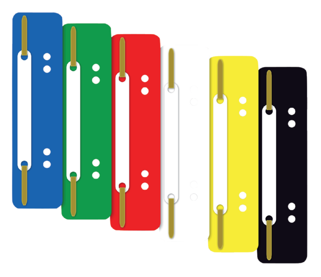 Description détailléeReliureFabriqué en PPDimensions modèle court 38x148mmAvec une reliure métallique recouverte de plastiqueLa reliure est dotée de 4 perforations pour convenir aux classeurs à levier ou à anneaux. Set de 10 reliures.