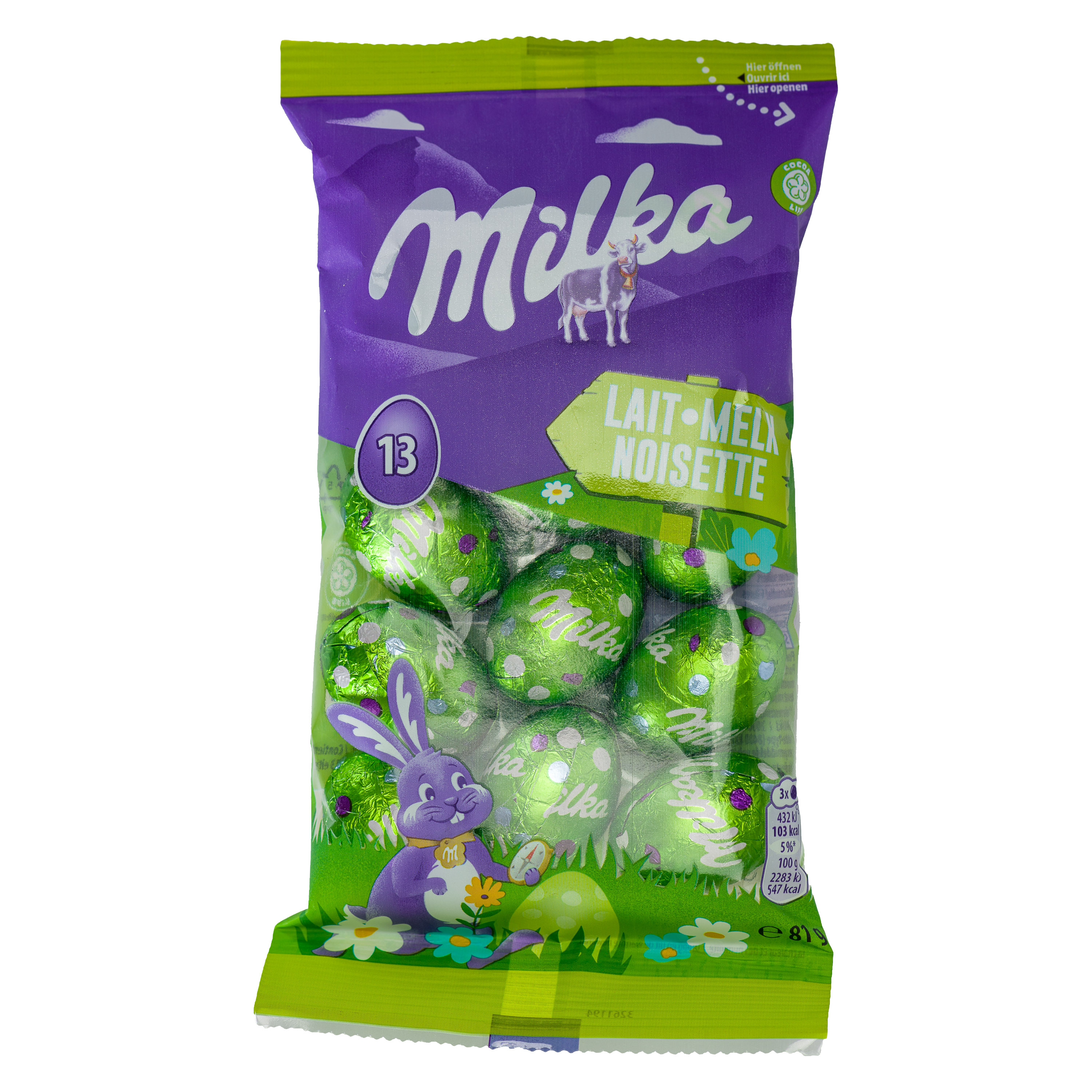 Ce sachet renferme 13 petits œufs en chocolat au lait Milka, délicatement associés à de savoureuses éclats de noisette pour une texture fondante et croquante à la fois.