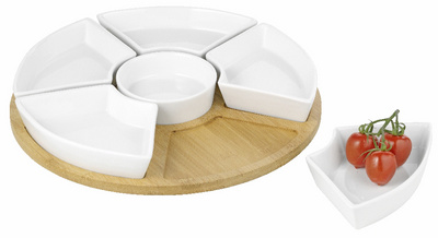 Description détailléePlateau rotatif en bambou, diamètre: 345 mm, incl. 6 coupelles en porcelaine blanche, passe au lave-vaisselle, idéal pour sucreries, amuse-gueules et snacks