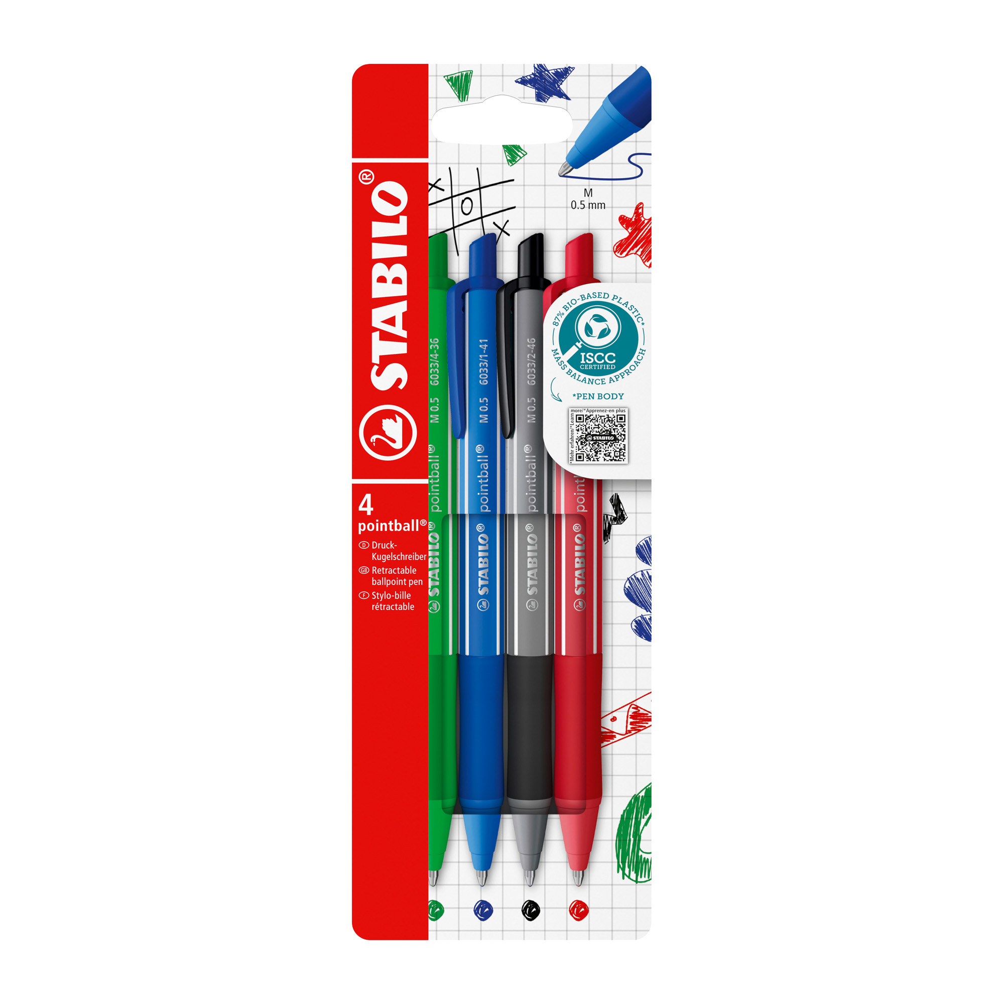 Disponible en 4 couleurs d'encre et de corps, STABILO pointball colorful est un stylo-bille rétractable à pointe moyenne et au tracé de 0,5 mm d'épaisseur. Fabriqué en Allemagne, STABILO pointball séduit par son exceptionnelle qualité de glisse, la fluidité de son tracé et le confort de son grip antidérapant. Equipé d'un clip, il s'emporte facilement partout. Pour les documents officiels, les coloris bleu, noir et vert sont infalsifiables.
