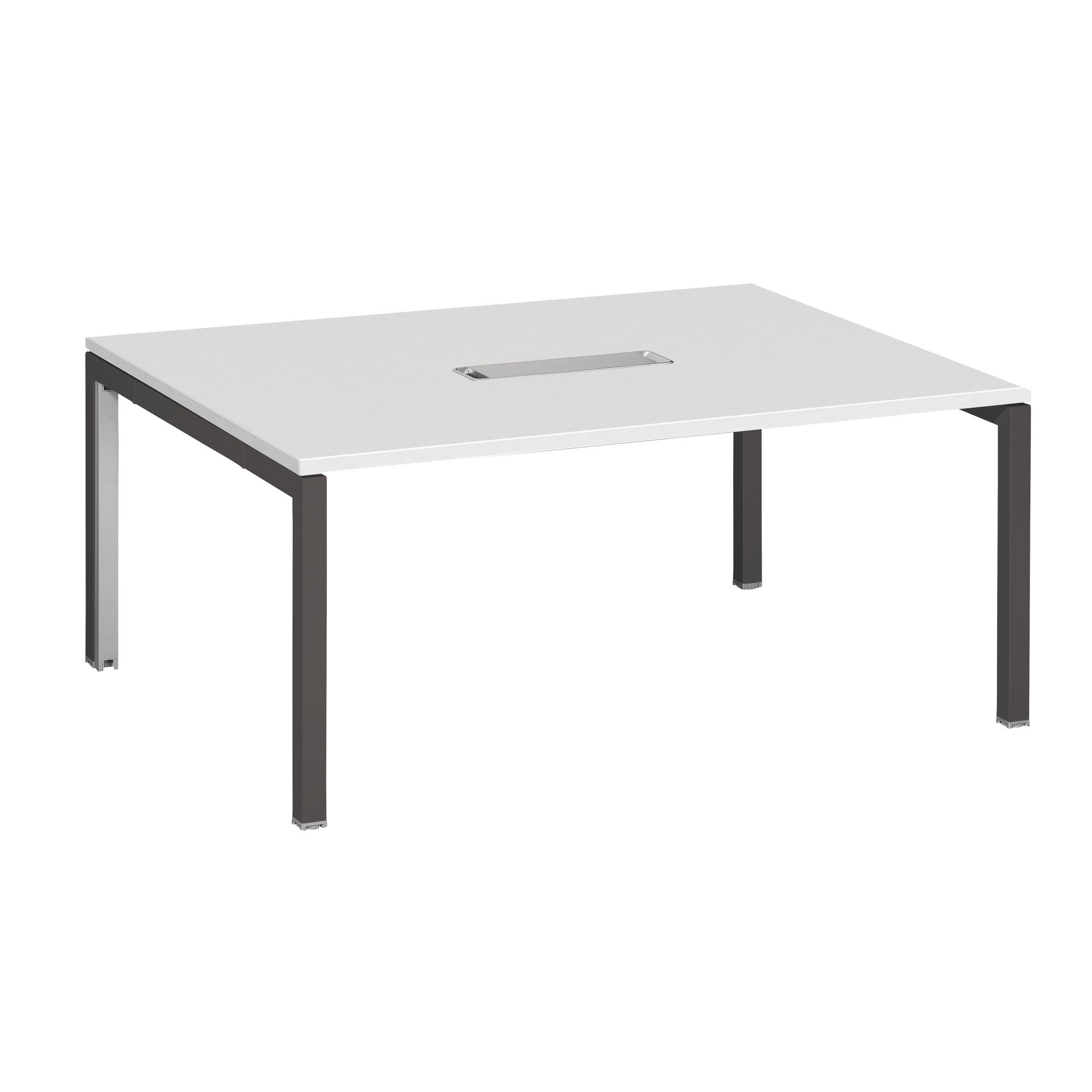 Cette table présente un chant droit de 2 mm en ABS et comporte un boîtier passe-câbles au centre du plateau (41,5 x 10,5 cm) avec goulotte métallique en ""U"" (dimensions utiles H 9 x L 38 x P 9 cm) et une trappe amovible plastique aluminium.