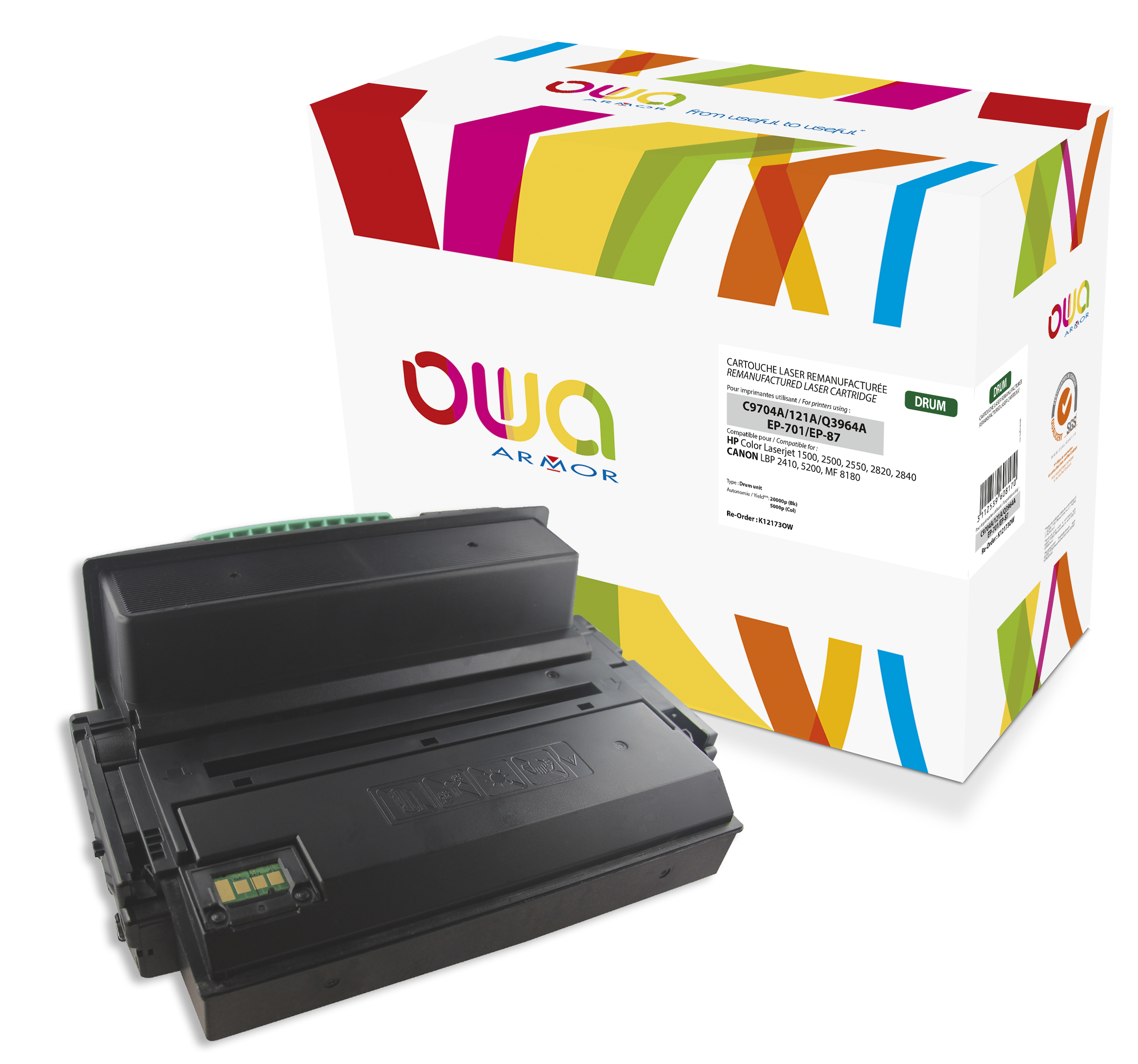 Autres cartouches avec les mêmes compatibilitésToner remanufacturé OWA - standard - pour HP C9701A, Q3961A, CANON 701C, EP-87Cà partir de76,95 € htTambour remanufacturé OWA - standard - 4 Couleurs - pour HP C9704A, Q3964A, CANON 701, EP-87à partir de84,95 € ht